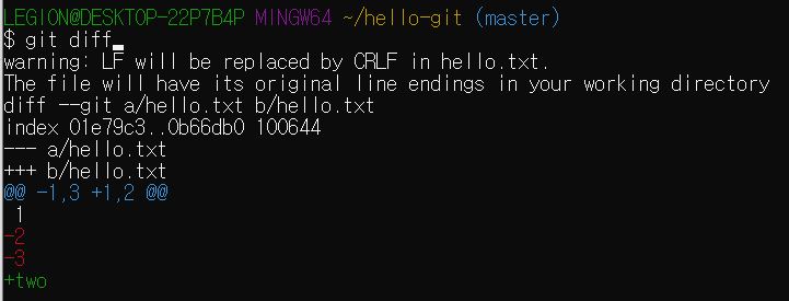 '-2'는 2가 삭제되었다는 뜻이고, '+two'는 two라는 내용이 추가되었다는 뜻이다.